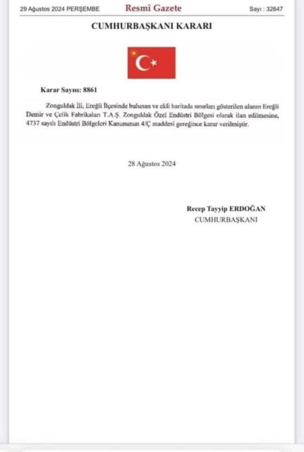 Erdemir, Resmi Gazetede yayınlanan kararla Özel Endüstri Bölgesi oldu.