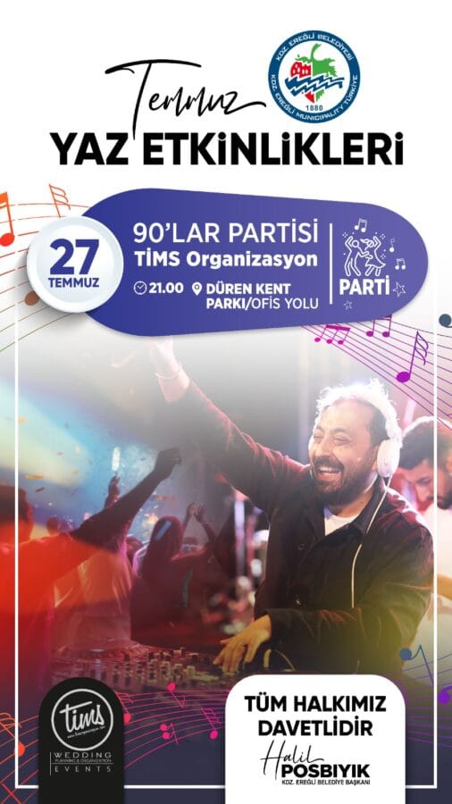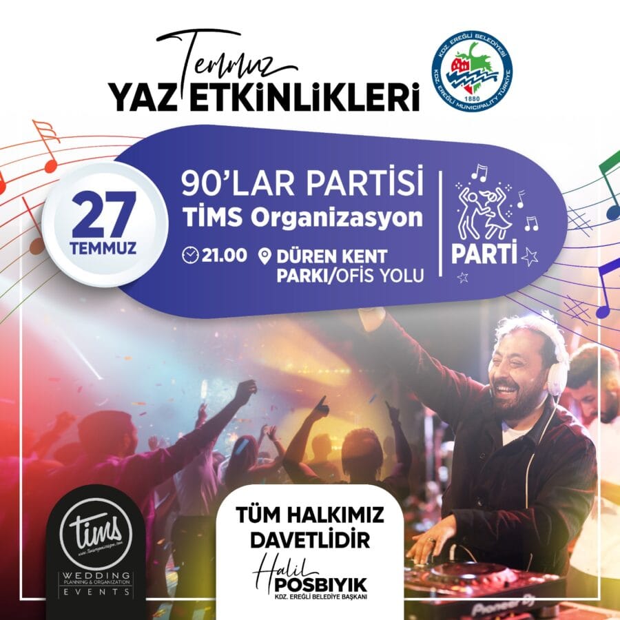 Cumartesi günü akşamı 90’lar partisi düzenlenecek. Tims Organizasyon işbirliğiyle Dürent Kent Parkı Süs Havuzu’nda saat 21.00’da 90’lar Partisi düzenlenecek.