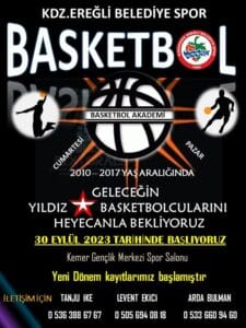 Kdz.Ereğli Belediyespor Basketbol Kış Spor Okulu 2023-2024 sezonu açılışı 30 Eylül 2023 Cumartesi günü gerçekleşecek. Bu yıl 2010 ile 2017 doğumlu kursiyerlerin katılabileceği 2022-2023 Sezonu Kış Basketbol Okulu, 30 Eylül 2023 ile 02 Haziran 2024 tarihleri arasında Kemer Gençlik Merkezi Spor Salonunda yapılacaktır.