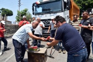 Çalışmalar hakkında bilgi alan Başkan Posbıyık, yılın en sıcak gününde, 40 dereceyi aşan sıcaklıklarda ortalama sıcaklığı 130-140 dereceyi bulan sıcak asfaltı seren işçilere kolaylıklar diledi, serinlemeleri için soğuk karpuz ikram etti.