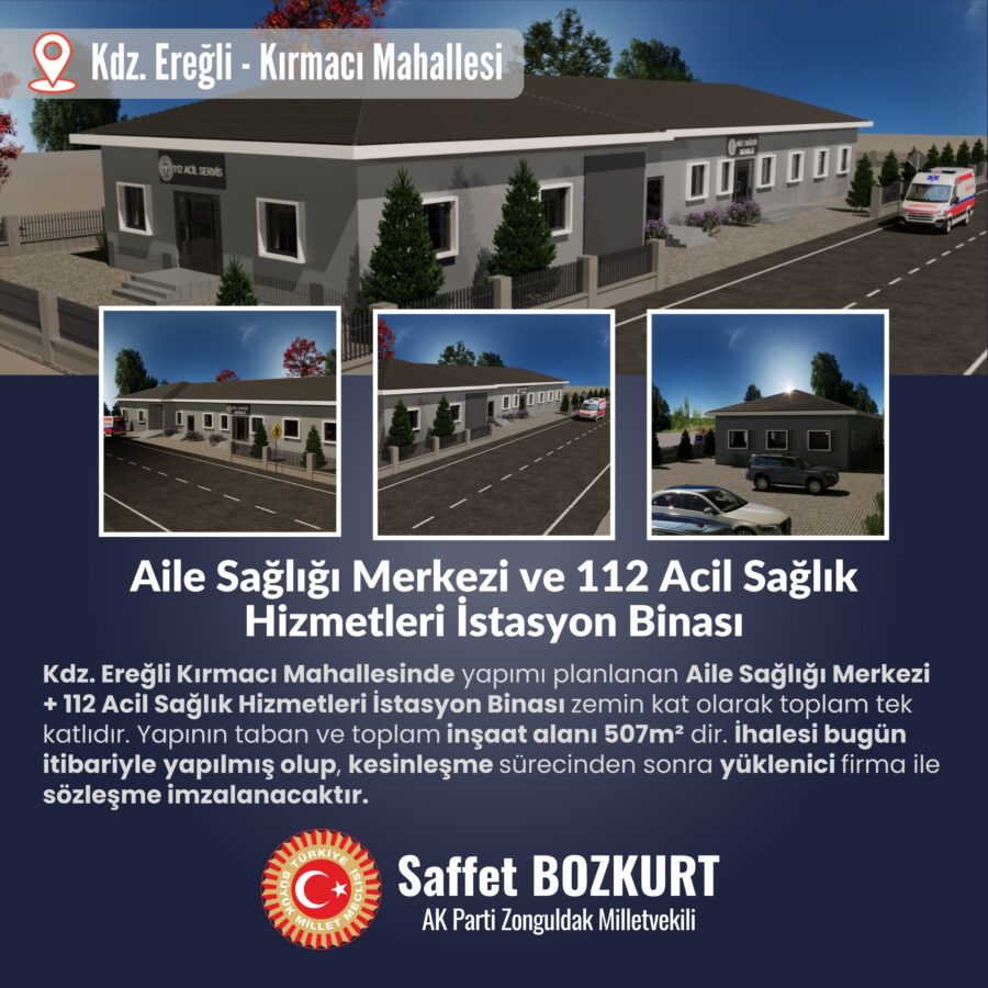 Kdz. Ereğli Kırmacı Mahallesinde yapımı planlanan Aile Sağlığı Merkezi + 112 Acil Sağlık Hizmetleri İstasyon Binası zemin kat olarak toplam tek katlıdır. Yapının taban ve toplam inşaat alanı 507m² dir. İhalesi bugün itibariyle yapılmış olup, kesinleşme sürecinden sonra yüklenici firma ile sözleşme imzalanacaktır.