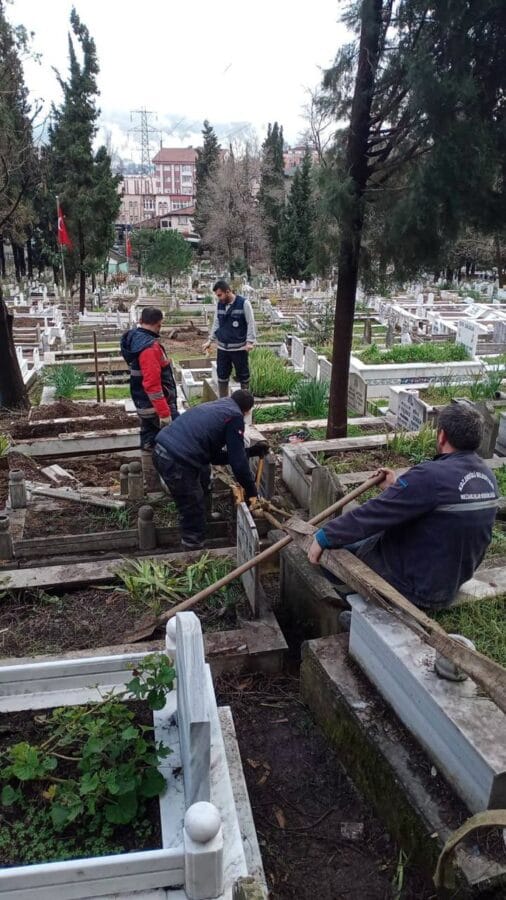 “Yaşadığımız büyük afet sonrası özellikle Şehir Mezarlığı ve Kestaneci Mezarlığı’nda devrilen ağaçlar nedeniyle çok sayıda mezarda hasar oluştu. Felaketin ardından Başkanımız Sayın Halil Posbıyık’ın talimatıyla tüm ekiplerimizde bakım ve onarım çalışmalarına başladık. Müdürlüğümüzdeki bay, bayan gassal, cenaze aracı şoförleri, mezarlık işçileri, memurlar ve tüm personel el birliğiyle devrilen ağaçları ve ağaçların köklerini kaldırdık, onarım işlerini yaptık. Kestaneci Mezarlığı’nın bir bölümünde çalışmamız sürüyor. Yaklaşan Kurban Bayramı nedeniyle 57 mezarlıkta ayrıca tırpan ve temizlik çalışmalarına başladık. Şuanda 30 mezarlıkta işimiz bitti, bayrama kadar tüm mezarlıkların temizliğini yapmış olacağız.”