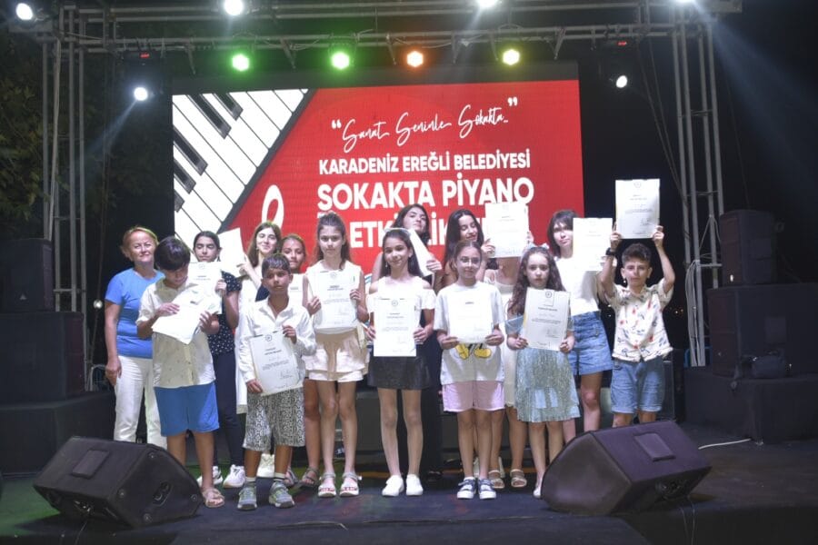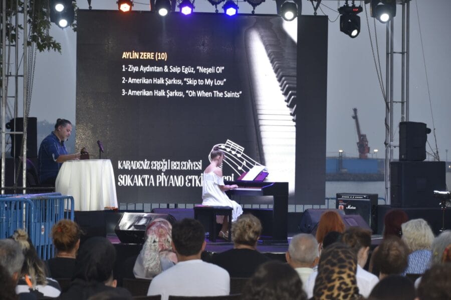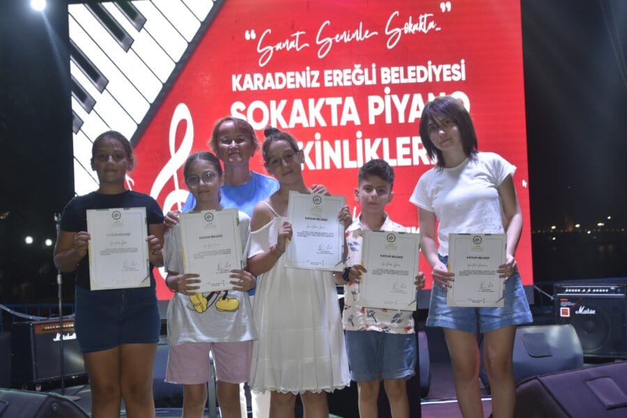 Kdz.Ereğli Belediyesi tarafından düzenlenen Sokakta Piyano Etkinliklerinde farklı yaşlardaki 15 öğrenci, bu kez sahil bandındaki Düren Kent Parkı’nda kurulan sahnede performanslarını sergilediler.