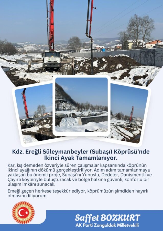 Kar, kış demeden özveriyle süren çalışmalar kapsamında köprünün ikinci ayağının dökümü gerçekleştiriliyor. Adım adım tamamlanmaya yaklaşan bu önemli proje, Subaşı’nı Yunuslu, Dedeler, Danişmentli ve Çayırlı köyleriyle buluşturacak ve bölge halkına güvenli, konforlu bir ulaşım imkânı sunacak.