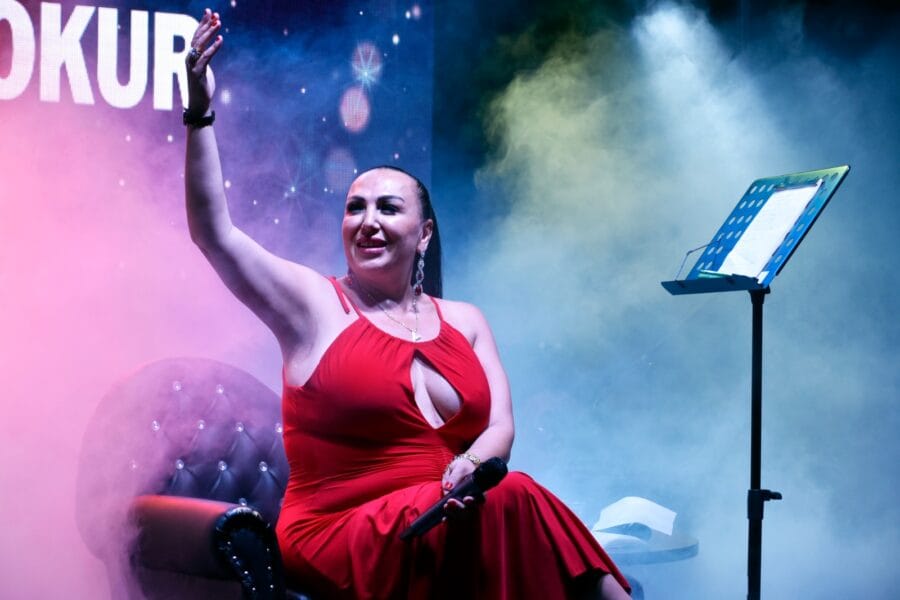 Yerli diva Yağmur Okur, konserini sahnede Neriman Posbıyık’la birlikte İzmir marşıyla tamamladı.