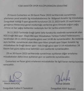 Zonguldak’ta hafta sonunda oynanacak olan amatör futbol müsabakaları şiddetli fırtına beklendiği için ertelendi.